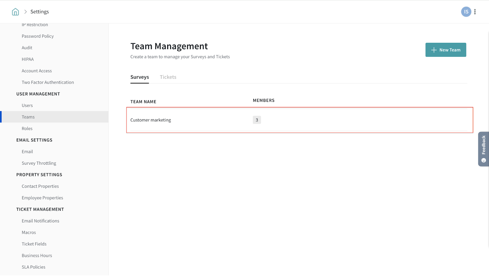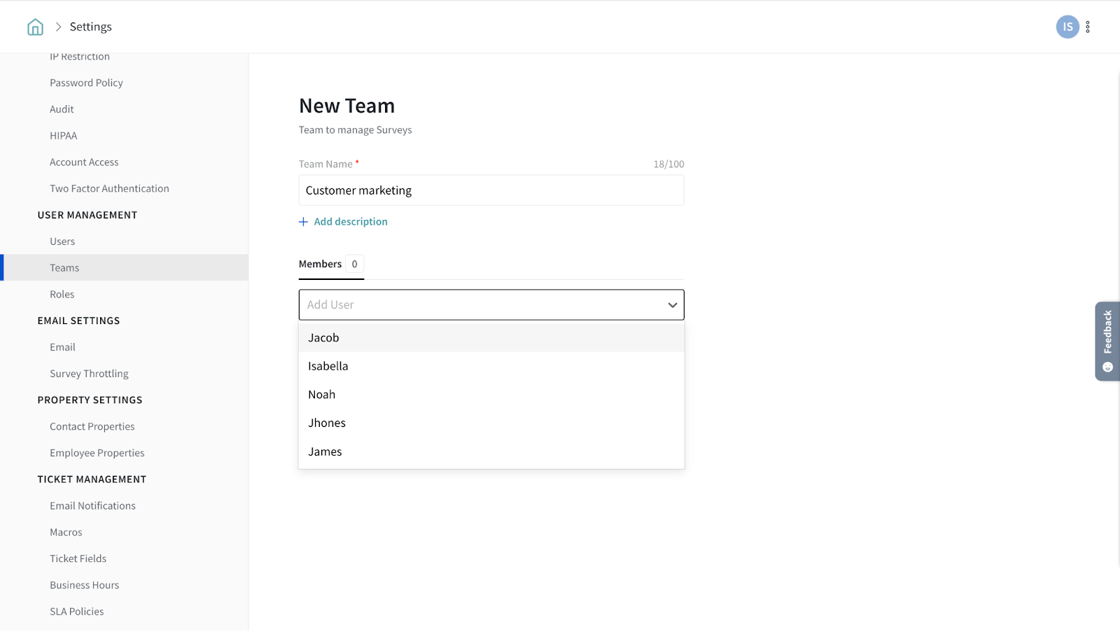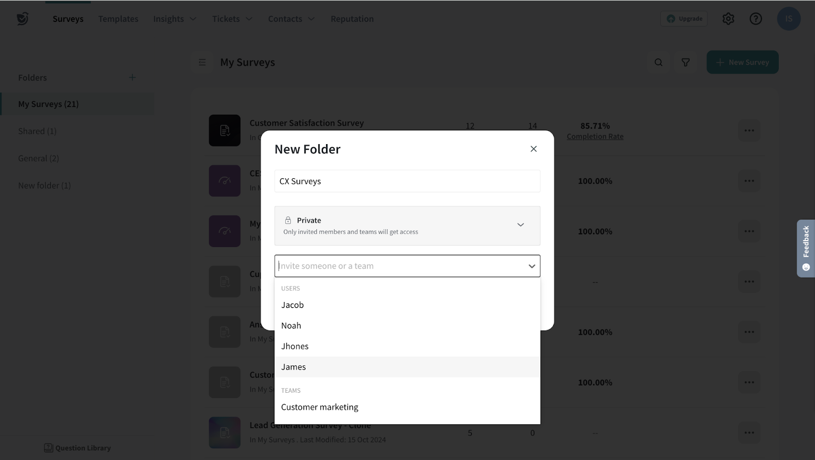 The team management feature helps you group and organize users. To control the visibility of surveys within a folder, you can create teams and add members to them. In this manner, a particular folder will be visible to only the Marketing team while another is visible only to the Engineering team.