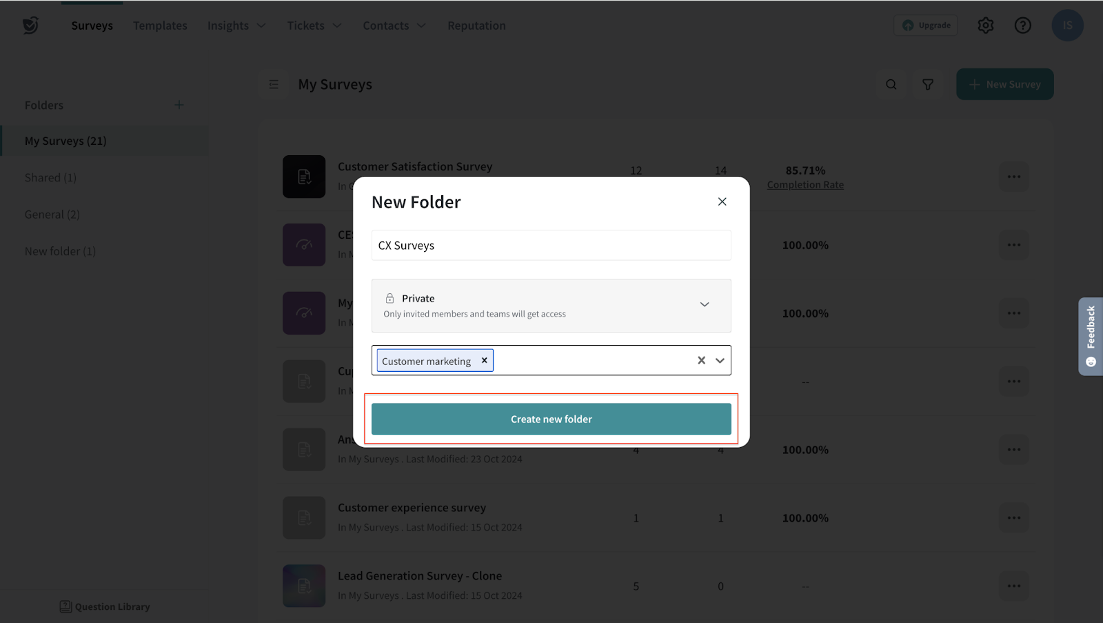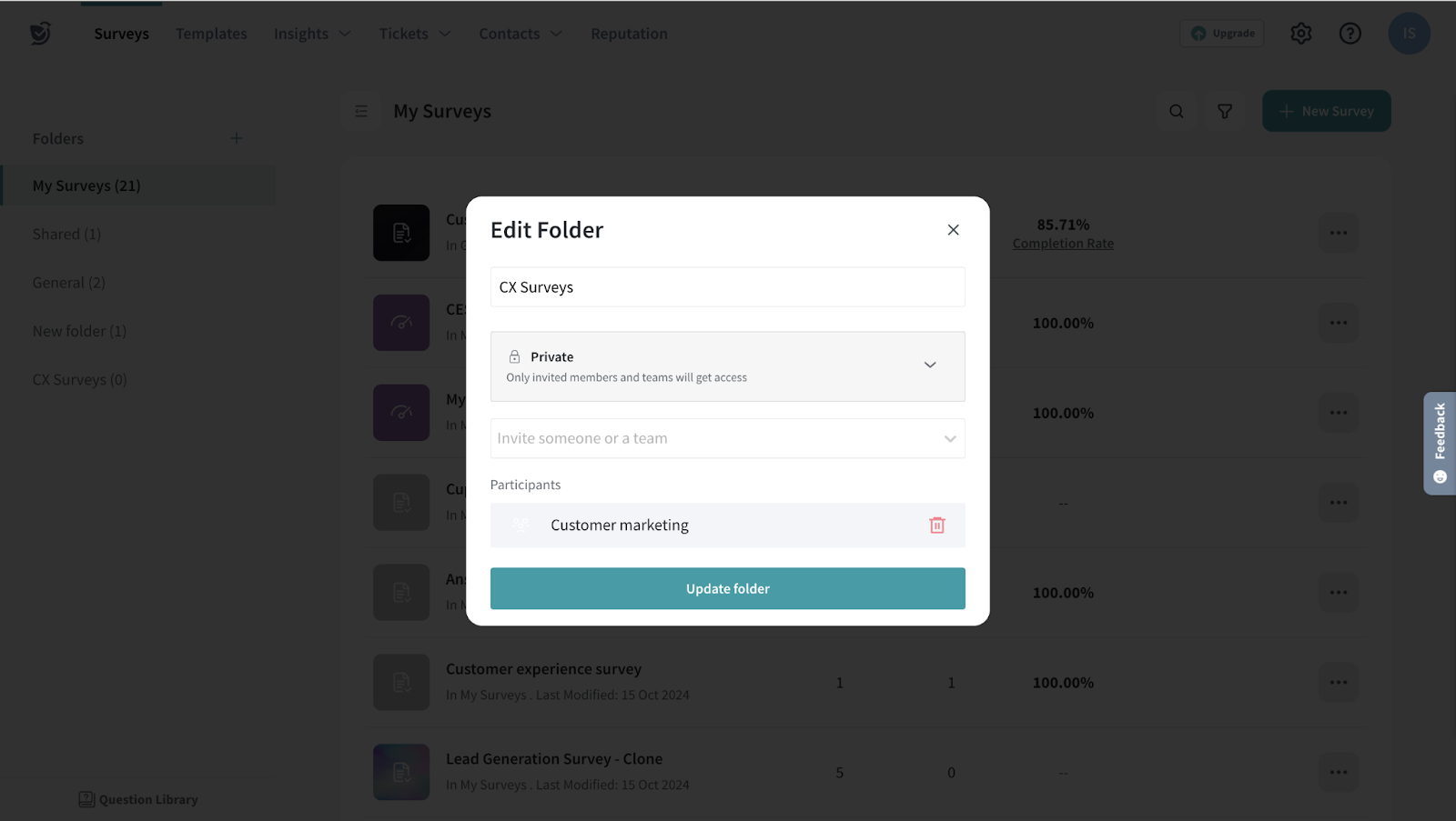 Let’s say you need to create a customer marketing team and have a dedicated folder with customer experience surveys accessible to them.