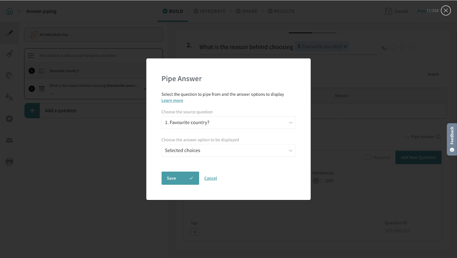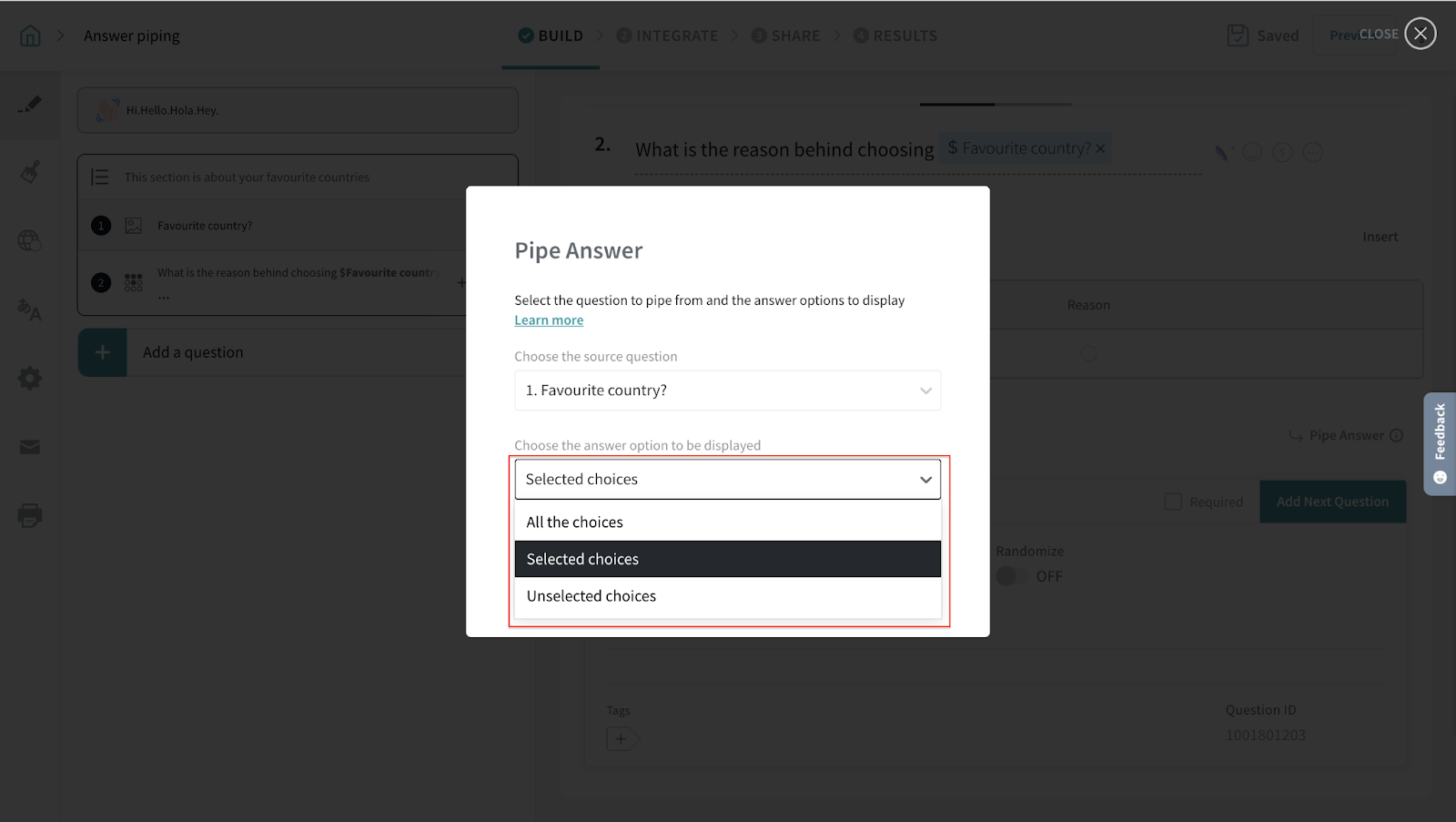 10. Once done, click on Pipe Answer, and choose the source question & answer options from their respective drop-downs.