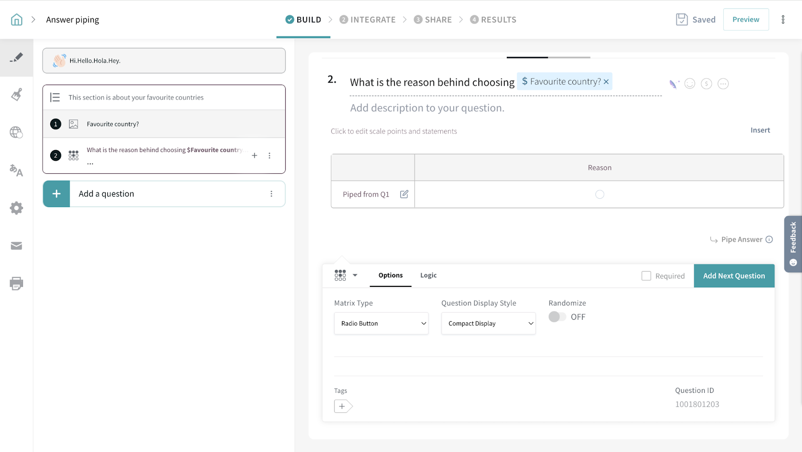 2. Create a Source Question first and pipe your responses to it by adding a follow-up question.