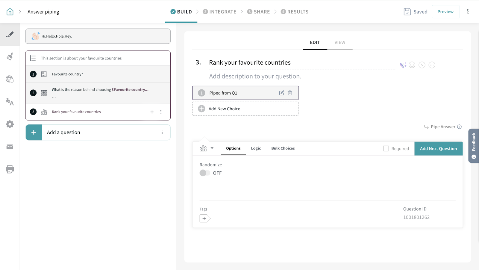 Once done, click on Pipe Answer, and choose the source question and answer options, from their respective drop downs. That's it! Now we'll see a preview of the survey.