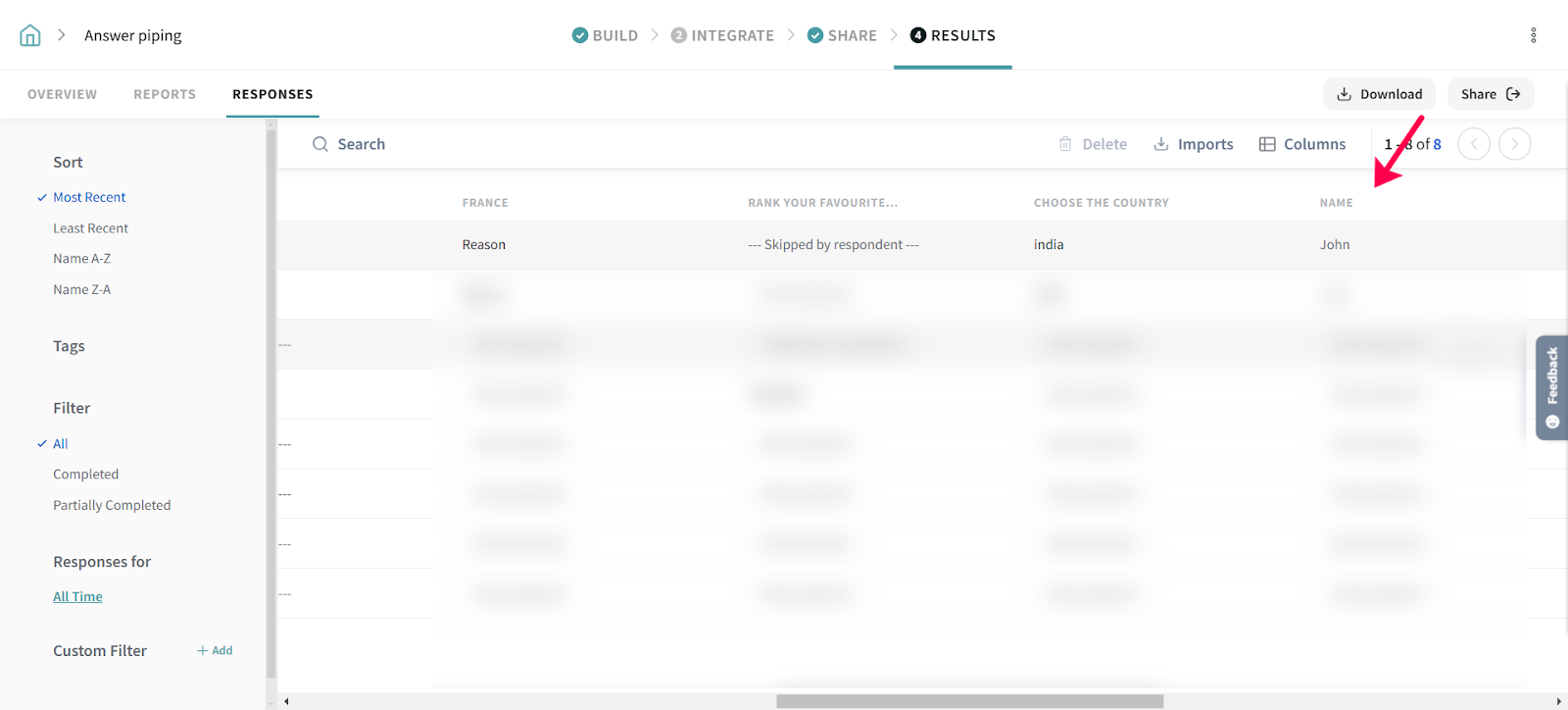 Once the user starts answering, a response entry will be created with the user's details added as custom variables.